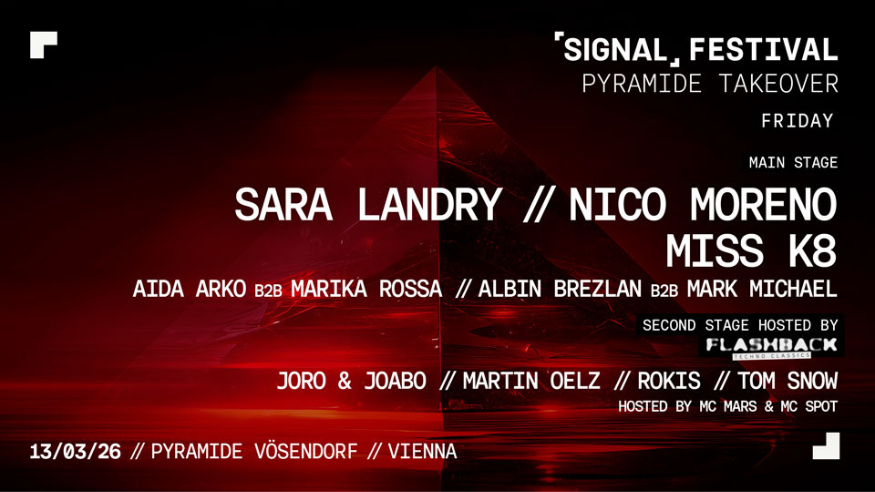Nach einem ausverkauften und vielbeachteten Auftakt im November 2025 kehrt das SIGNAL Festival im März 2026 mit einem zweitägigen Festival zurück. Am 13. und 14. März 2026 verwandelt SIGNAL die ikonische Pyramide Vösendorf erneut in einen zentralen Treffpunkt für internationale elektronische Musik.