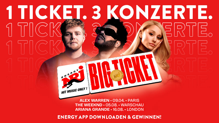 ENERGY-App herunterladen, mitspielen und das ENERGY BIG TICKET gewinnen: Wir bringen euch zu Alex Warren in Paris, Ariana Grande in London und The Weeknd in Warschau. Los geht’s am 14. Februar 2026!